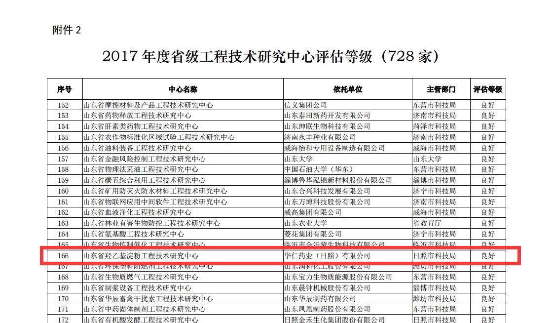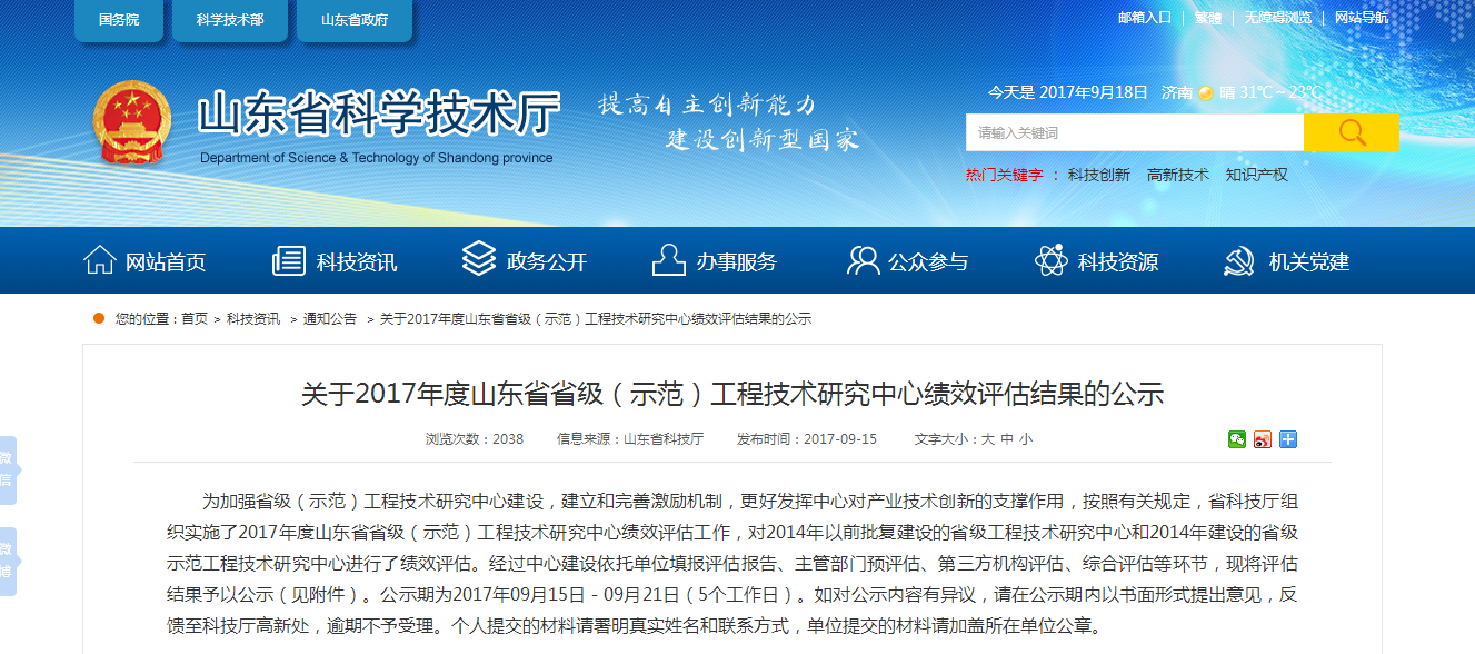 9月15日,山东省科学技术厅对2017年度山东省省级(示范)工程技术研究中心绩效评估结果进行了公示,由免费a片 (日照)有限免费a片筹建的山东省羟乙基淀粉工程技术研究中心绩效评估等级结果良好,顺利通过评估进入公示,本次公示期为2017年9月15日-9月21日(5个工作日)。