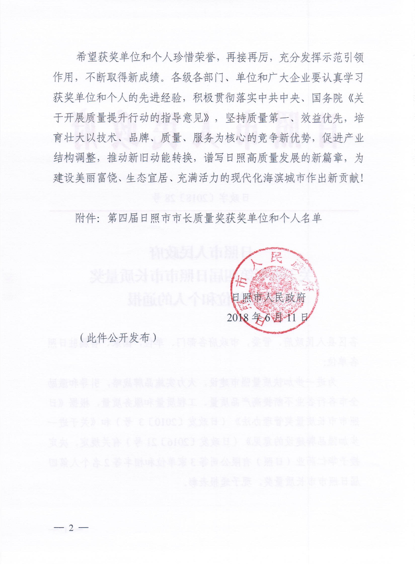 6月11日,日照市人民政府发布了《关于表彰第四届日照市市长质量奖获奖单位和个人的通报》,免费a片经过初审、社会满意度测评、专家材料评审、陈述答辩以及专家现场评审等众多环节的考验,最终获得该项荣誉。