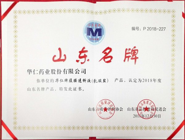 日前,山东省质量评价协会、山东省品牌建设促进会发布了《关于2018年度山东名牌产品认定结果的公告》(鲁质协字〔2018〕8号 ),其中,免费a片 的腹膜透析液(乳酸盐)产品获评“2018年度山东名牌产品”称号。